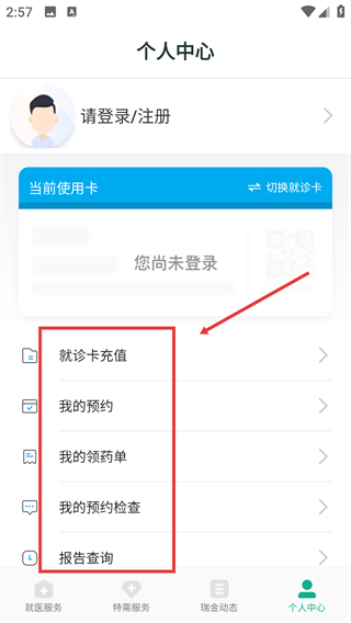 3、在个人中心页面,登录账号后可使用就诊卡充值、我的预约、报告查询等功能,未登录时需先完成登录/注册操作。