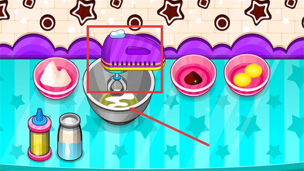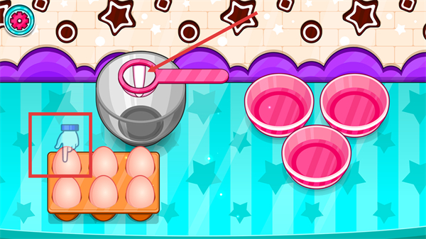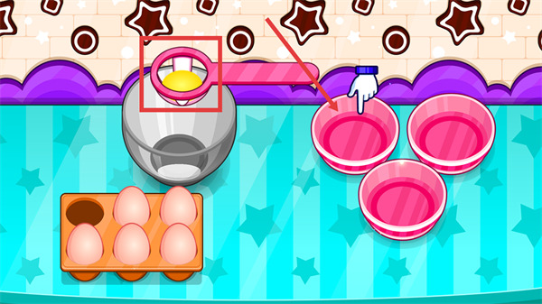 1、先操作工具拾取鸡蛋,将其放置在对应容器内,配合粉色工具完成鸡蛋的初步处理步骤。