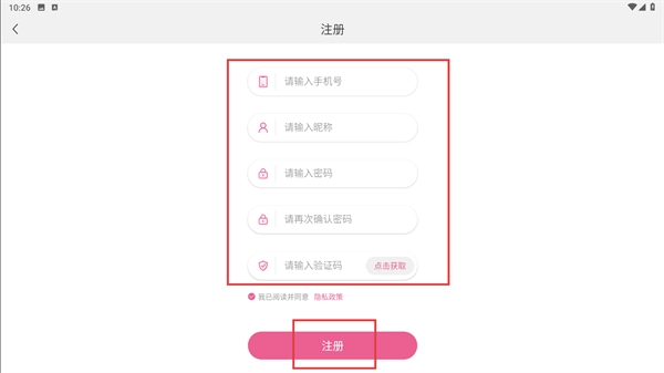 2、进入注册界面后,依次在对应输入框填写【请输入手机号】【请输入昵称】【请输入密码】及确认密码。
