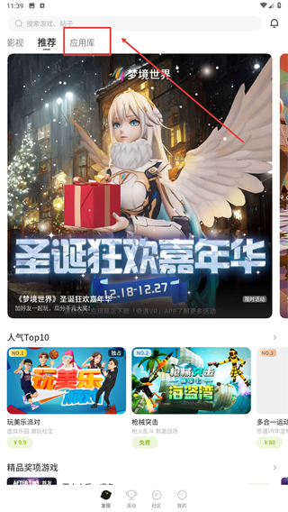 2、进入主界面后,点击顶部【应用库】选项,切换至应用列表页面,可查看各类VR应用资源。