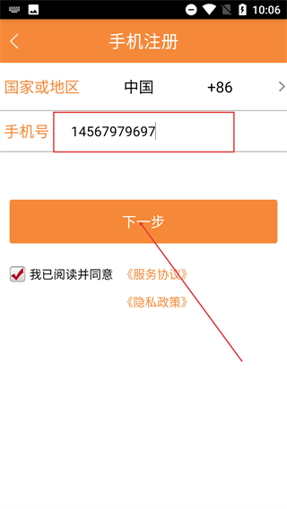 3、在手机注册界面填写【手机号】,勾选协议后点击【下一步】按钮,推进注册流程。
