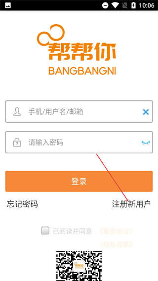 2、在【帮帮你】登录界面,点击【注册新用户】选项,进入账号注册流程,可选择手机注册方式。