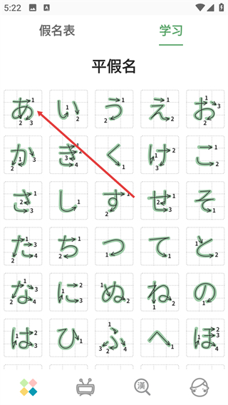2、进入学习页面的平假名板块,这里会展示平假名的书写笔顺(标注数字顺序),点击具体的假名(比如“あ”),就能进入该假名的详细学习页面。