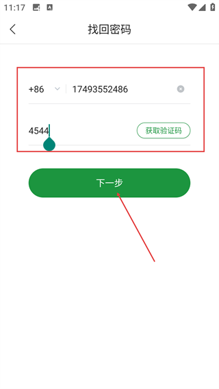 3、进入【找回密码】页面后,首先填写手机号码,接着点击【获取验证码】按钮并输入收到的验证码,随后点击【下一步】按钮以继续后续操作。