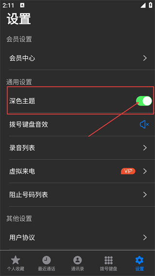 2、打开【设置】页面,在通用设置区域找到【深色主题】的开关选项,此开关可用来调节应用的显示主题样式。
