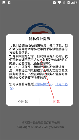 1、首次打开应用时,要先查看【隐私协议】和【用户协议】,在完整阅读完毕后,再选择【同意】或者【不同意】来继续使用应用。