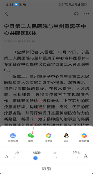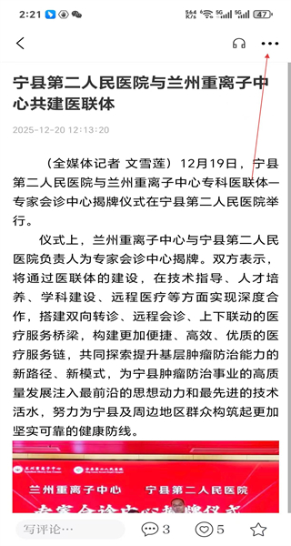3、进入文章详情页,查看医联体共建的具体内容,点击右上角功能按钮准备进行分享操作。
