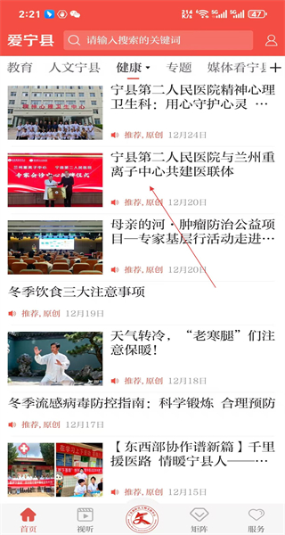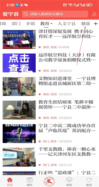 1、打开爱宁县软件首页,看到教育等分类栏,点击健康选项切换到健康类资讯页面。