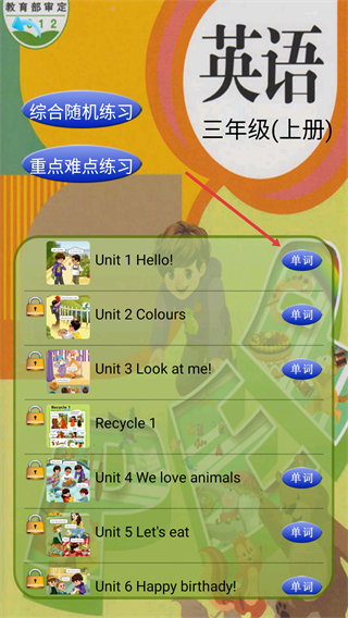 1、在【优乐点读机】界面中,选择【三年级(上册)】教材封面,可进入该教材的单元学习页面。