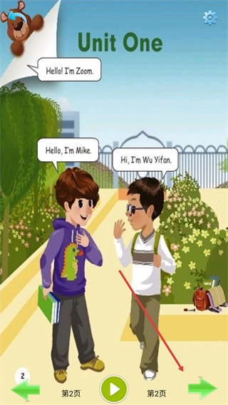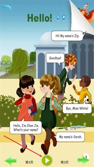 4、点击右侧箭头切换到第3页后,再次点击播放按钮,可播放当前页的对话音频,继续学习单元内容。