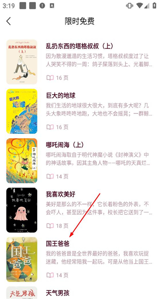 3、进入限时免费绘本列表页面,浏览到国王爸爸等绘本,选择该绘本点击进入详情页面。
