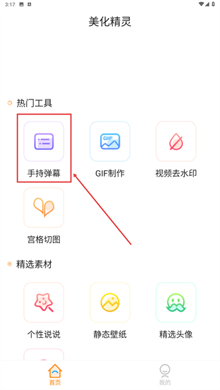 1、打开“美化精灵”首页,找到“热门工具”区域,点击其中的【手持弹幕】选项,即可进入弹幕制作功能页面。