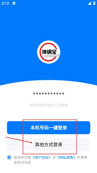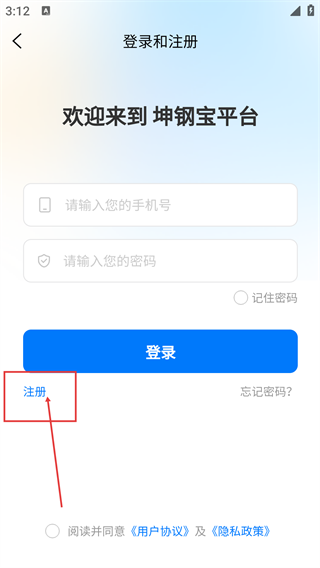 1、打开坤钢宝应用后,界面会弹出《服务协议和隐私政策》的提示窗口,用户需仔细阅读相关内容,之后点击【同意并接受】按钮,才能继续进入后续的操作界面。