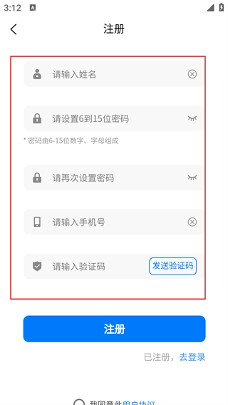 4、进入注册页面后,按顺序填写姓名、密码,输入手机号,点击【发送验证码】按钮并填写收到的验证码,最后点击【注册】按钮完成操作。