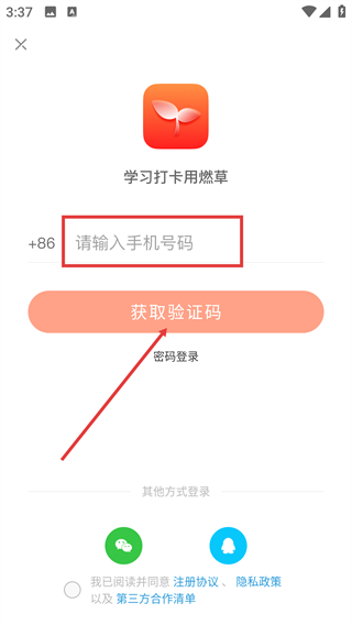 这是“燃草”学习打卡类的登录页面,提供【本机号码一键登录】【手机号登录】以及微信、QQ第三方登录这几种方式。