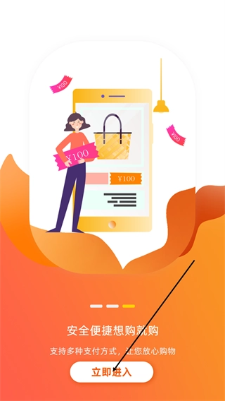 1、在应用启动页,点击【立即进入】按钮,即可进入百成优品的主界面,该页面支持多种支付方式,保障购物安全便捷。