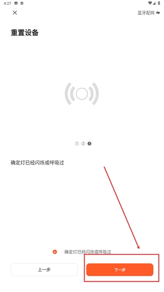 3、在重置设备页面,确认灯已闪烁/呼吸后,勾选对应选项,点击【下一步】推进配网流程。