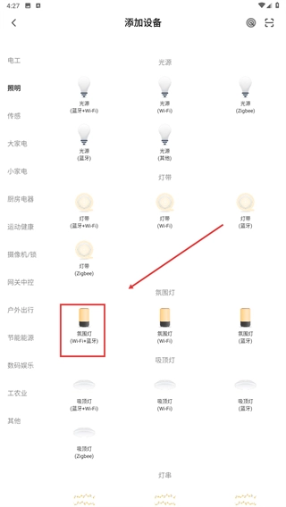 2、于添加设备页面,选择目标设备类型(如【氛围灯(Wi-Fi+蓝牙)】),进入该设备的配置流程。