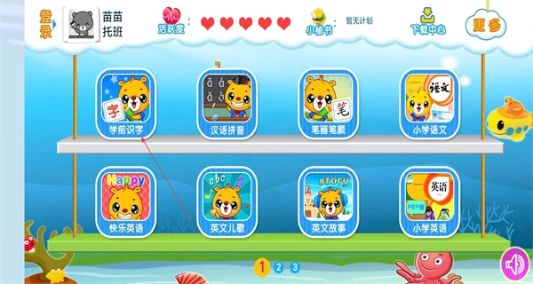 1、打开软件后,进入主界面,可看到学前识字等多个学习模块,点击学前识字模块,进入对应页面。