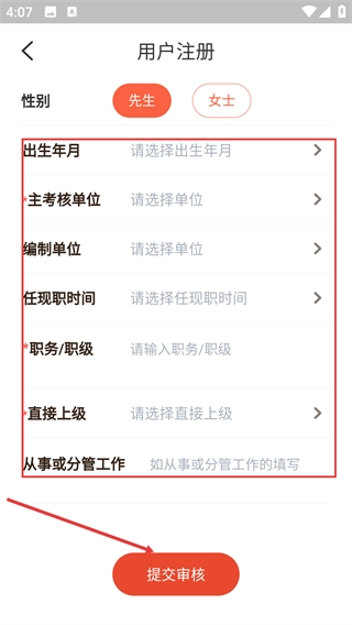 3、继续完善注册信息,选择出生年月、编制单位等选项,填写职务/职级、直接上级等内容,点击【提交审核】按钮。