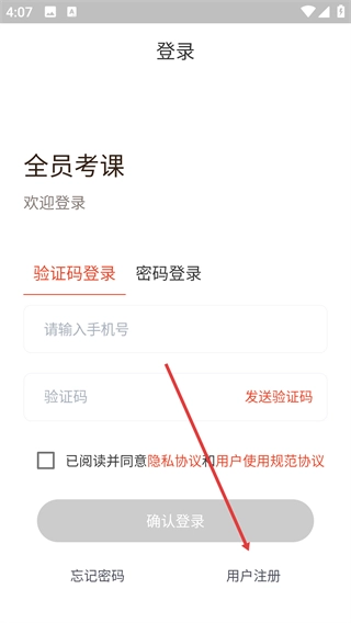 1、这是“全员考课”平台的登录页,提供“用户注册”功能,点击【用户注册】开始注册流程。