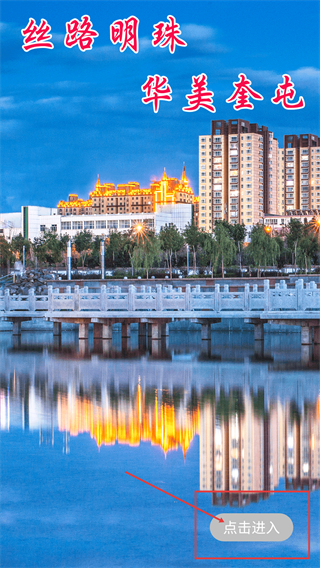 1、看到带有【丝路明珠-华美奎屯】文案的页面时,点击页面中的【点击进入】按钮,即可进入软件的主界面。
