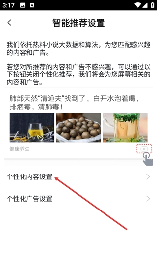 3、进入智能推荐设置页面后,点击【个性化内容设置】选项,就能进入内容推荐的开关配置界面。