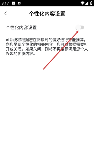 4、进入个性化内容设置界面后,可借助开关按钮开启或关闭此功能,以此调整依据阅读偏好的内容推荐状态。