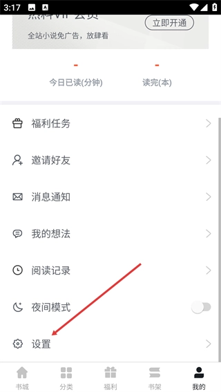 在小说阅读应用的“我的”页面,点击【设置】选项,即可进入该应用的设置功能界面。