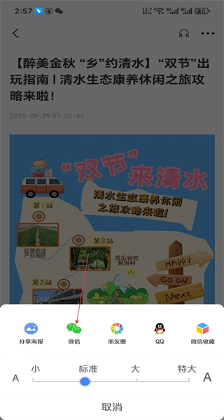 3、进入文章详情页,查看清水生态康养休闲之旅的攻略内容,点击右上角功能按钮。