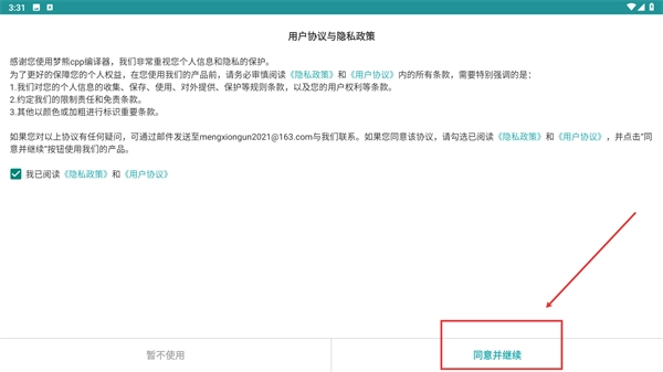 在“用户协议与隐私政策”页面,勾选“《隐私政策》和《用户协议》”选项后,点击【同意并继续】按钮,即可进入梦熊C++编译器的主界面。