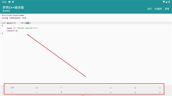 2、在编译器的编辑页面,你可以借助底部的键盘来输入C++代码(比如示例中的“HelloWorld”程序),从而完成代码的编写工作。