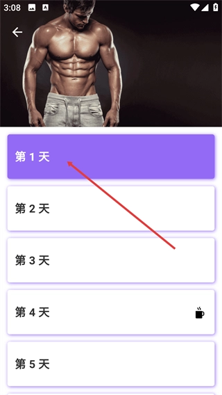 2、进入训练项目的日程界面后,选择对应天数(如【第1天】),可进入该天的具体训练动作列表页面。