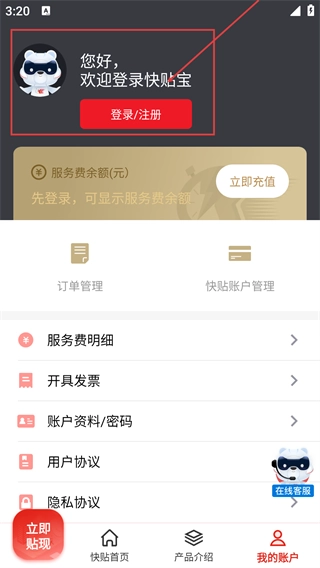 2、在“我的账户”页面,需点击【登录/注册】按钮完成账号验证;该页面包含订单管理、服务费明细等功能。