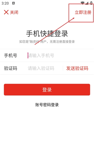 3、进入手机快捷登录页面,若未注册账号,点击右上角【立即注册】选项,切换至注册信息填写界面。