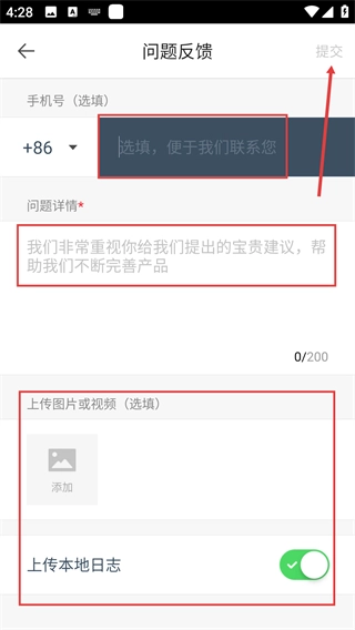 3、在【问题反馈】页面,需完成信息的完整填写后,点击右上角【提交】按钮,即可提交反馈内容。