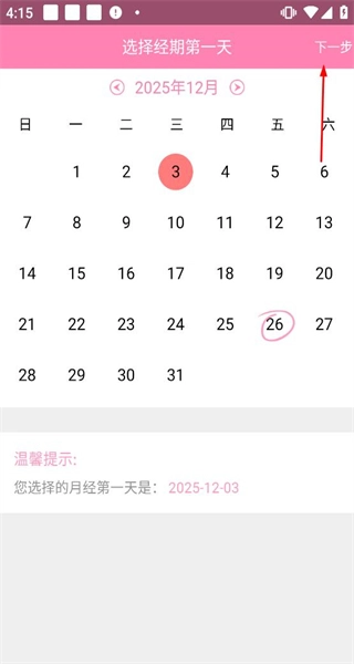 4、登录后进入选择经期第一天页面,选定日期后点击下一步按钮完成经期初始设置。
