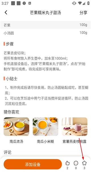 3、进入养生壶食谱页面,浏览到芒果糯米丸子甜汤等食谱,选择该食谱点击进入详情页。