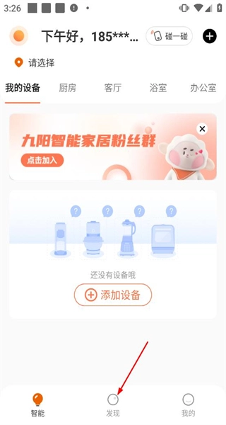 1、打开软件后,进入智能页面,看到添加设备等入口,点击底部发现选项进入内容页面。