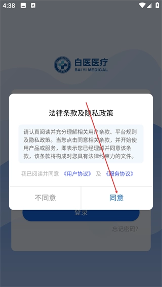 1、进入应用后,阅读并确认【用户协议】【服务协议】,点击【同意】按钮即可进入登录相关操作。