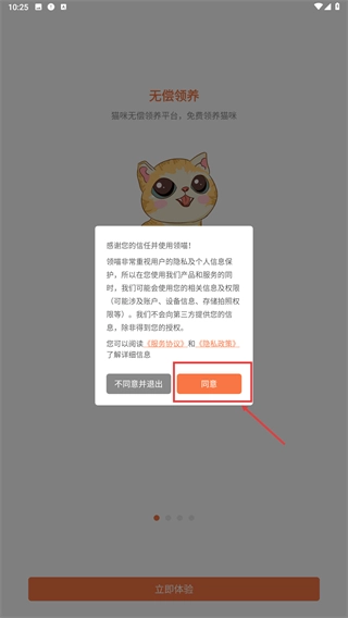 1、在【领喵】的隐私政策弹窗内,阅读《服务协议》与《隐私政策》后,点击【同意】按钮以继续操作。