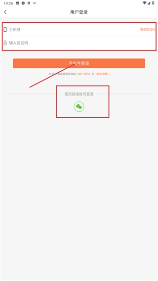 3、进入用户登录页后,可选择填写【手机号】并获取验证码完成登录,或点击【微信】图标用其他账号登录。