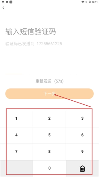 3、进入短信验证码输入页面后,使用数字键盘输入收到的验证码,确认无误后点击【下一步】按钮,即可完成验证流程。