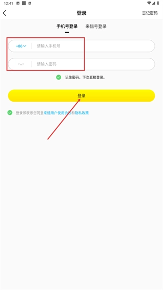 4、选择来惜号登录时,填写【请输入来惜号】与【请输入密码】,确认协议后点击【登录】完成流程。