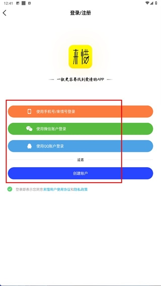 2、进入登录/注册页后,可选择【使用手机号/来惜号登录】【使用微信账户登录】等方式,或点击【创建账户】完成注册。