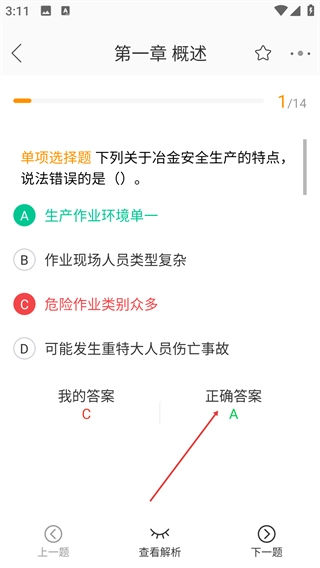 4、提交答案后,对比【我的答案】与【正确答案】,明确错题点,借助题目解析梳理【冶金安全生产的特点】相关知识,提升备考效率。