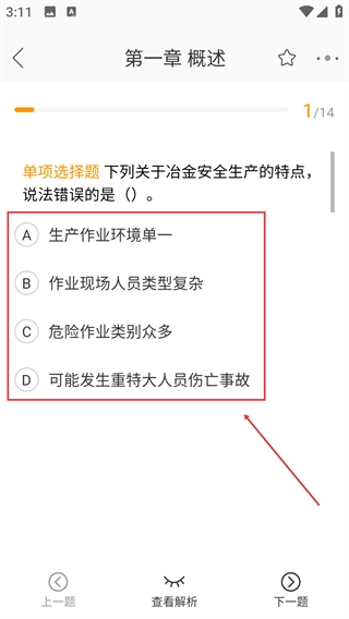 3、进入章节题目页后,查看【单项选择题】的题干,在选项中选择答案,也可点击【查看解析】。