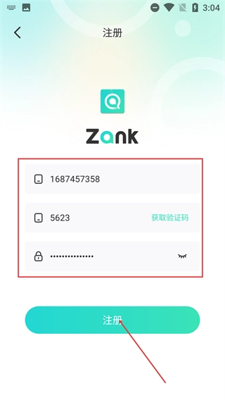 3、在【Zank】注册页面,依次填写账号信息、获取并填入【验证码】、设置密码,完成信息填写后点击【注册】按钮提交。