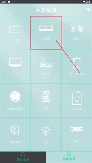 1、在“添加设备”页面,选择【空调】分类,进入空调设备的添加流程。