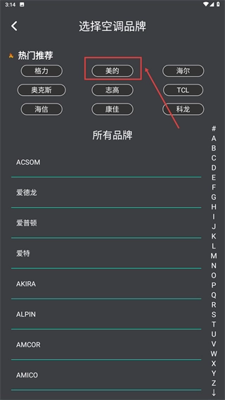 2、于“选择空调品牌”页面,从热门推荐中点击【美的】,选定对应品牌。